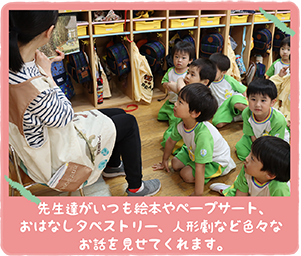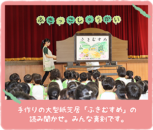 ☆絵本の読み聞かせや大型紙芝居・人形劇などを通して、たくさんのお話しを楽しみます。
