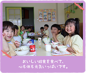 ☆温かくておいしい給食を通して、食事の大切さに気付いたり、友達と一緒に食べる楽しさを味わったりすることができるようにしています。