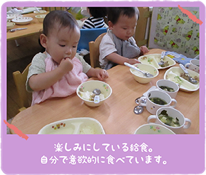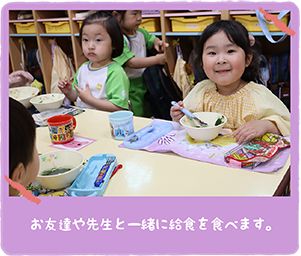 ☆温かくておいしい給食を通して、食事の大切さに気付いたり、友達と一緒に食べる楽しさを味わったりすることができるようにしています。